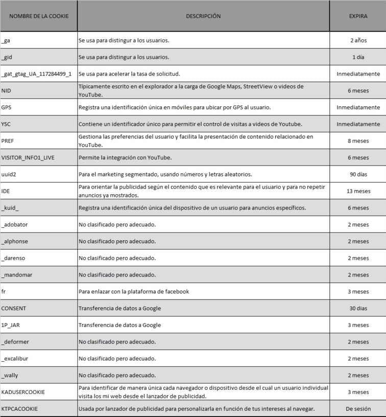 Las tablas de las cookies se irán actualizando según vayamos usando más en nuestra WEB, por nuevas funcionalidades de la misma. Bien es cierto, que en el momento de implantar esas nuevas funcionalidades, habrá un impás muy corto de tiempo en el que esas nuevas cookies no aparecerán en las tablas, hasta que no las tengamos al día. En este sentido, agradecemos tu comprensión.