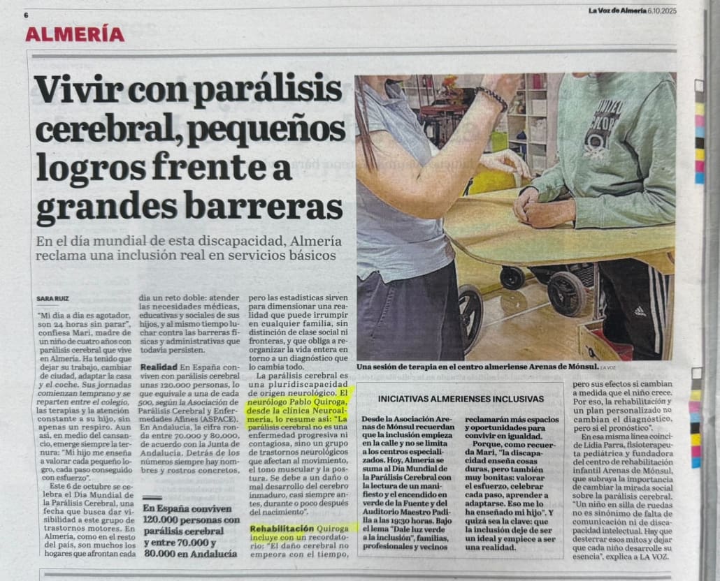 Noticia publicada en la voz de Almería donde el Doctor Pablo Quiroga nos habla sobre la parálisis cerebral